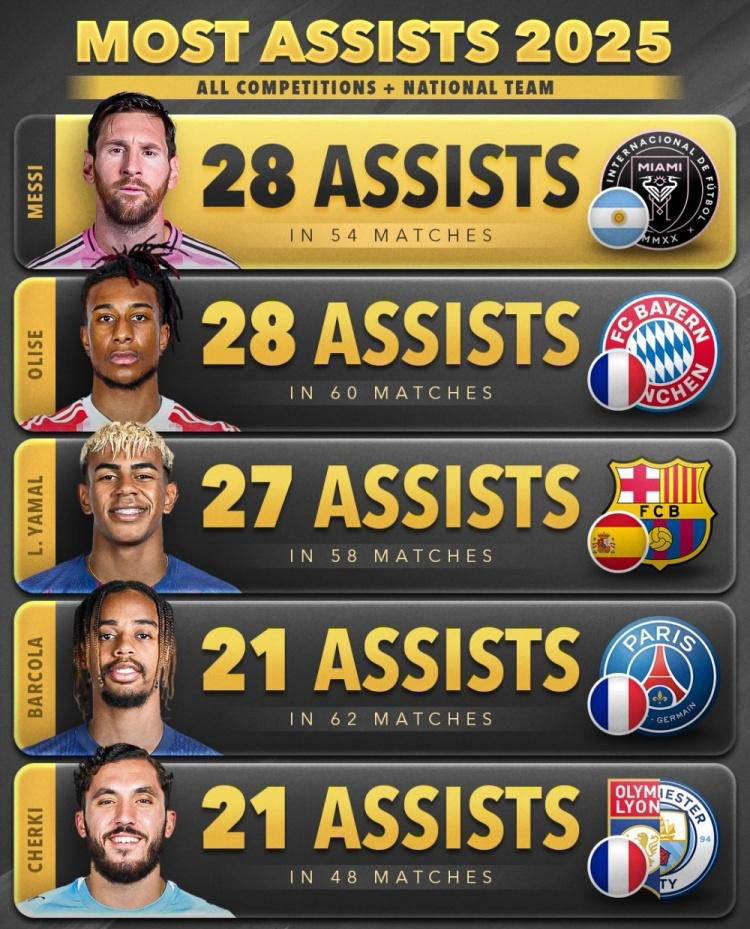 数据显示,梅西本年度共出战54场比赛,贡献28次助攻,荣登榜首;奥利塞以28次助攻排名第二,但出场60场比赛;第三名亚马尔58场27次助攻;第四名巴尔科拉62场贡献21次助攻;第五名谢尔基48场同样传出21次助攻。以上五人构成了当前世界助攻精英榜的前五名。