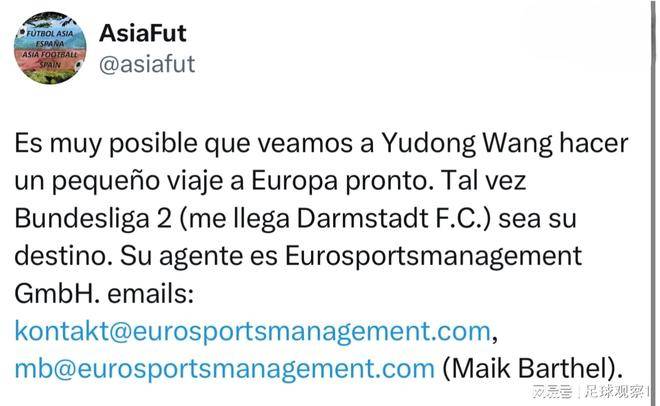2025年11月27日,据专注亚洲足球的知名媒体人AsiaFut报道,国足前锋王钰栋将在冬季转会窗口前往德国乙级联赛,加盟德乙劲旅达姆施塔特队。据了解,王钰栋将以租借方式加盟这支球队。此前,王钰栋刚刚签约了EuroSportsManagement经纪公司,该公司专注于德语区的欧洲足球市场,包括德甲、德乙以及瑞士超级联赛等联赛。从这一点来看,王钰栋前往德乙的可能性非常高。